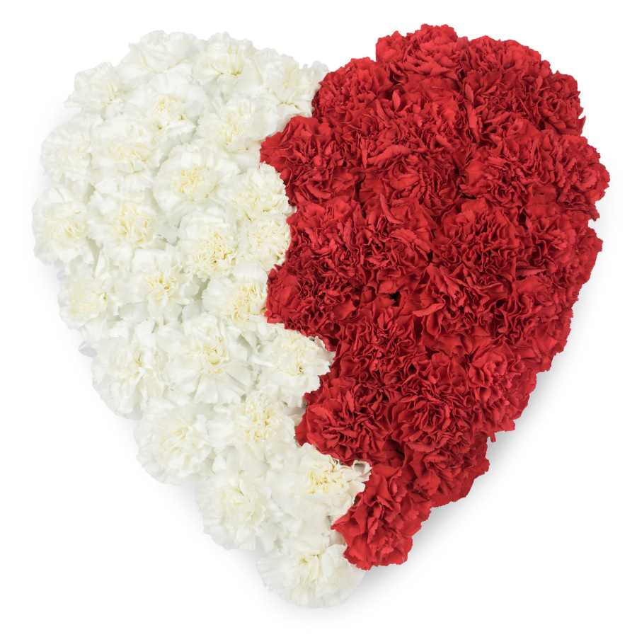 Delight in the exquisite design of our heart-shaped bouquet by Handy Flowers. This outstanding arrangement combines white and red carnations, epitomizing grace and compassion, ideal for expressing heartfelt sympathy.