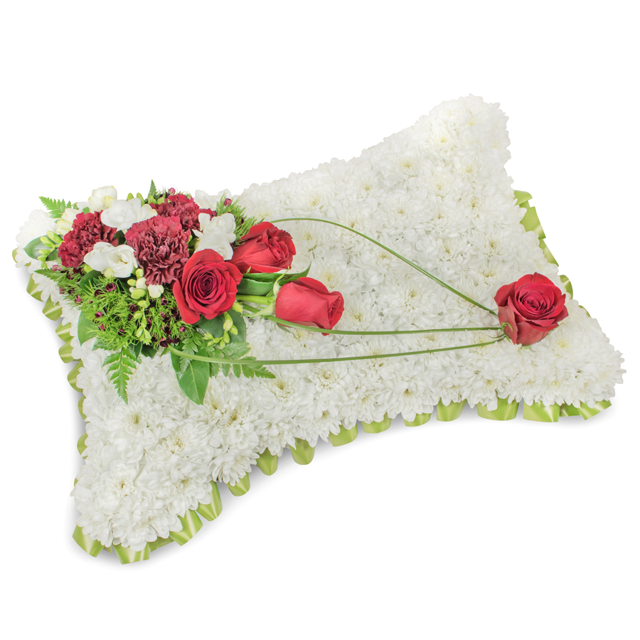 Show your support with our sympathetic flower arrangement, featuring exquisite white chrysanthemums, elegant red roses, fragrant white freesias, stunning dark red carnations, graceful dianthus, and lush bear grass.